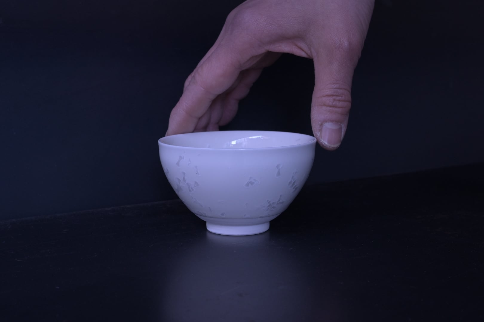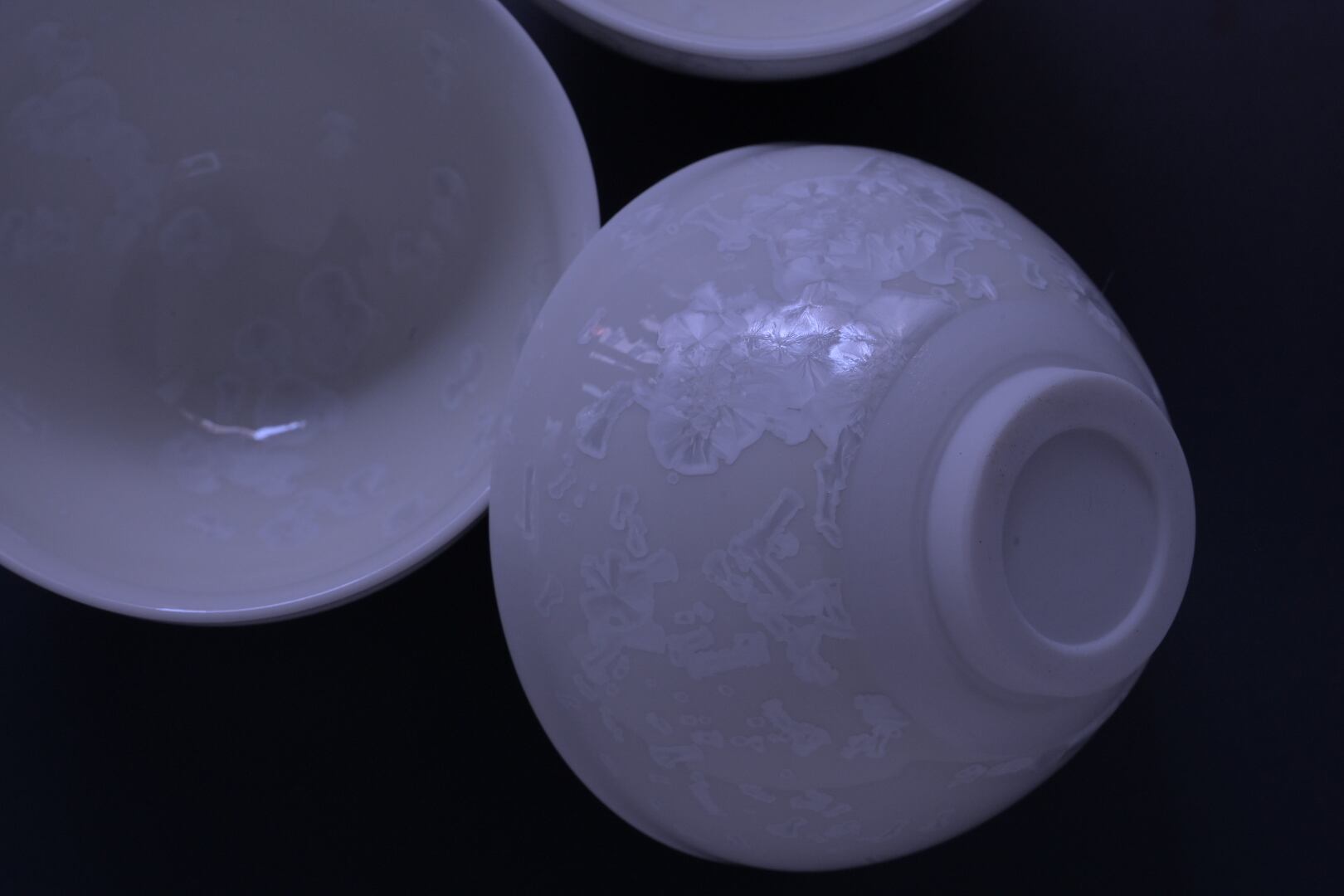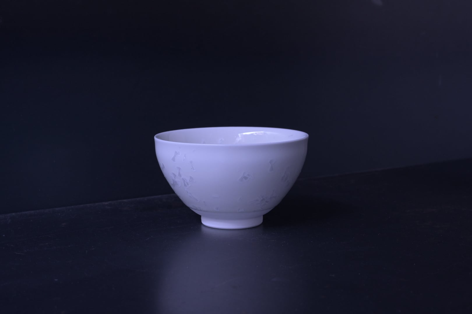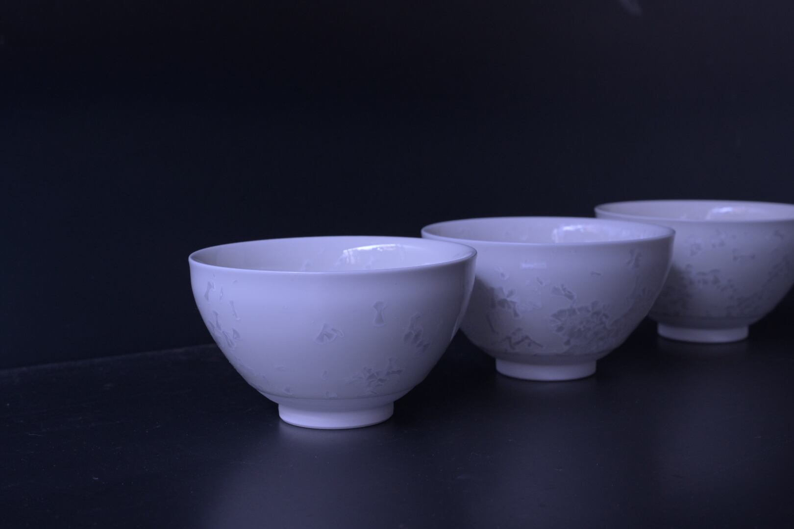 焼成の過程で釉薬が変化し、器の表面にまるで花が咲いたような結晶模様が現れます。釉薬の調合や窯の温度のわずかな違いによって、結晶の形はひとつとして同じものは生まれません。