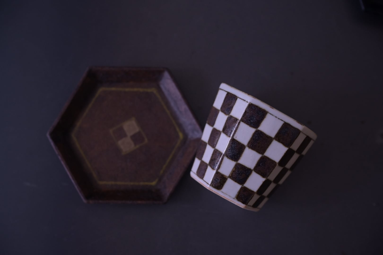 高島大樹 六角杯と皿(市松茶)(コラボ)