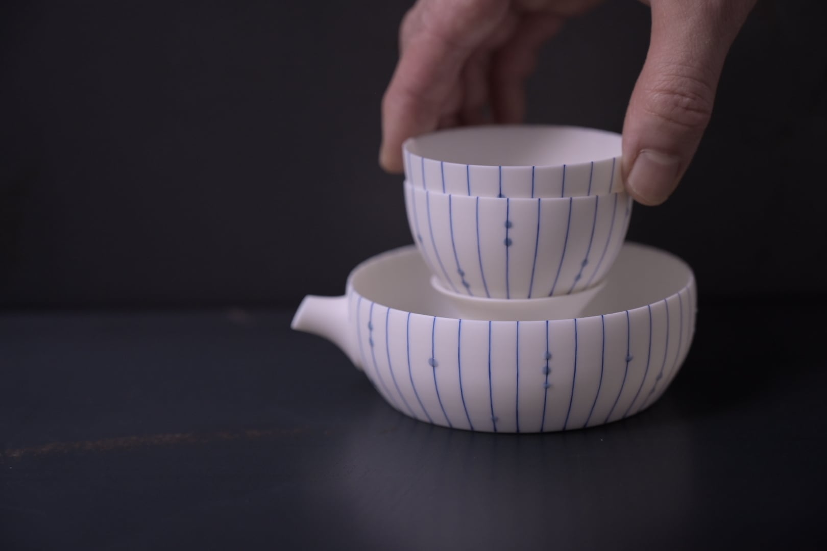 生地が薄く透光性のある土を使用しているため、綺麗な色の変化を楽しめます。また焼成後に一本づつ筆を用い、手で模様を描いています。