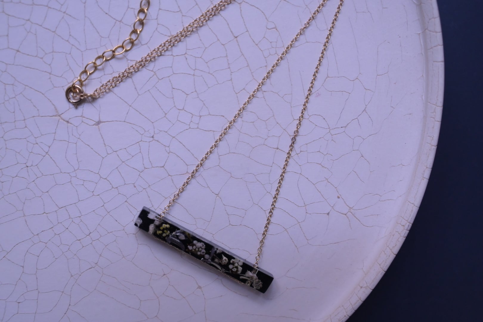 1つ1つ手作業でレイアウトされる繊細な植物はまるで標本のような世界を作り出し、樹脂と金属との組み合わせが美しくモダンなデザインです。