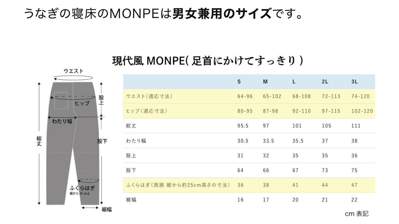 形は昔ながらのもんぺに比べ、膝下がスリムな「現代風MONPE」の型です。